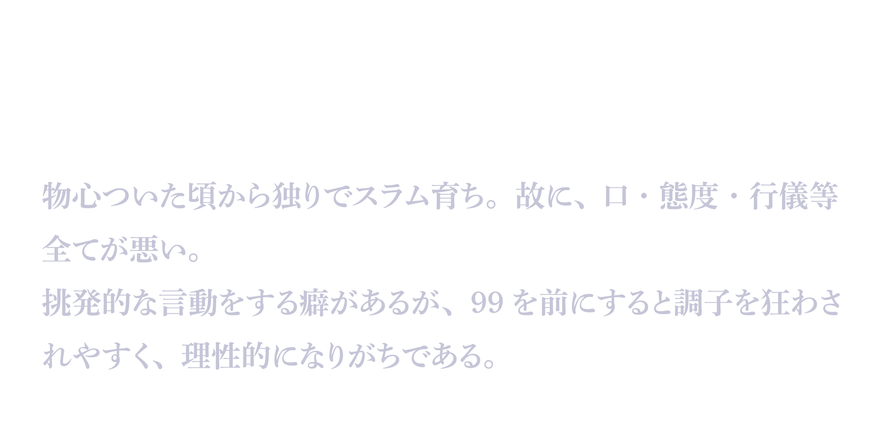 そんな彼は、日々盗みを働いたり、人から物を騙し取ったりすることで生き延びていた。特に、伯都の方からやってきた人間は大金を持っている上に平和ボケしていて騙しやすい。良い行いをして気持ちよくなろうとした人間が「せっかく情けをかけてやったのに」と怒声を上げて追いかけてくる滑稽な様を見ては、嘲笑いながら逃げる生活をしていた。ある日、食料を調達して住処に戻ると、同じくらいの歳の子どもが眠っていた。すやすやと上品に居眠りをする子ども...もとい水色髪の少年は、足元が少々汚れているものの、一目で金持ちの息子だということが分かるほど身なりが整っている。